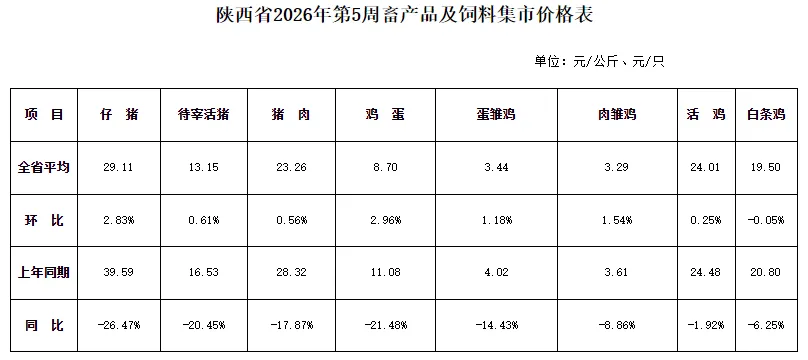 从区域分析,陕南地区仔猪平均价格28.40元/公斤,环比上涨0.42%,活猪平均价格13.31元/公斤,环比下降0.08%,猪肉平均价格23.25元/公斤,环比上涨0.52%;关中地区仔猪平均价格28.90元/公斤,环比上涨1.69%,活猪平均价格13.03元/公斤,环比上涨0.70%,猪肉平均价格23.04元/公斤,环比上涨0.83%;陕北地区仔猪平均价格30.51元/公斤,环比上涨8.46%,活猪平均价格13.19元/公斤,环比上涨1.46%,猪肉平均价格23.68元/公斤,环比上涨0.08%。