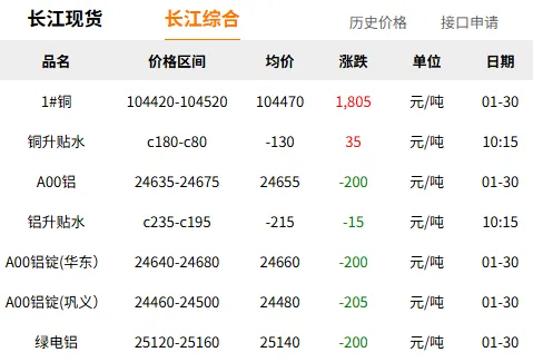 >【今日铜价】01月30日长江有色1#铜行情播报