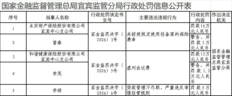2026年1月16日,国家金融监督管理总局宜宾监管分局披露处罚信息:覆盖永安财产保险股份有限公司宜宾中心支公司、和谐健康保险股份有限公司宜宾中心支公司,3名责任人,合计罚款37.2万元,核心违规集中在未按照规定使用经备案的保险费率、虚列会议费、贷款管理不尽职,严重违反审慎经营规则。