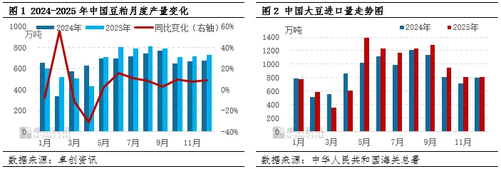 【导语】 2025年豆粕产量在原料宽松的主要支撑下同比有所增加,月度产量基本随大豆供应水平变化,低点出现在4月,高点出现在8月。进入2026年,国内需求支撑及国际丰产基础上大豆进口或仍处高位,中国豆粕产量存在继续走高预期,或限制豆粕价格上方空间。