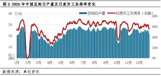 从更高频的日度供应数据来看,2025年中国大豆压榨企业日度开工负荷率波动有所放大。其最高值出现在6月下旬,达到74.43%,最低值出现在1月下旬,为0.42%,全年开工负荷率波动区间为74.01个百分点。一季度日度开工负荷率整体呈现“M”型走势。1月上游企业在压榨利润良好的刺激下开工水平走高,月底随着春节假期普遍停机开工降至年内低点。2月春节假期后上游开工水平有所恢复,但下旬开始直至4月阶段性原料供应衔接问题使得上游企业开工负荷率震荡下行。市场供应明显收紧,需求端集中抢货,市场情绪高涨,供需矛盾推升豆粕现货价格涨至年内高点。5月开始大豆通关放宽及南美大豆集中到港,原料支撑开工水平上涨至年内高位并持续4个月左右,期间上游企业库存压力限制开工负荷率上方空间。10月受双节假期影响,国内开工水平先跌后涨,原料供应压力下较快恢复至高位运行。11-12月虽大豆到港季节性下滑,但叠加结转库存原料供应仍偏宽松,支撑上游企业开工水平高位震荡,多数生产计划稳定,库存问题导致部分工厂开工受限。下半年豆粕市场面临普遍催提情况,供需格局宽松持续,拖累豆粕现货价格长时间于低位窄幅波动。