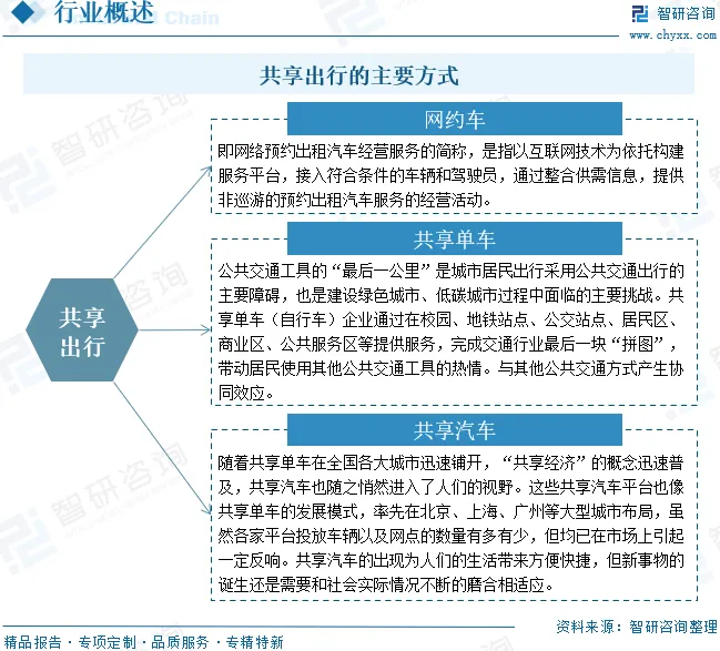 共享出行是指人们无需拥有车辆所有权,以共享和合乘方式与其他人共享车辆,按照自己的出行要求付出相应的使用费的一种新兴交通方式。包括以打车软件、共享单车为代表的一大批创新模式。随着共享出行需求不断延展,行业发展持续创新,共享出行的主要方式包含专车、快车等网约车服务;共享单车;分时租赁服务如共享汽车等。