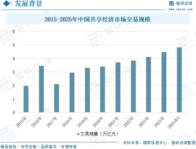 共享经济作为以互联网平台为核心的新型经济模式,其核心理念在于通过技术手段优化社会资源配置,显著提升各类资源的利用效率。在这一宏观框架下,共享出行作为其重要的组成部分,通过共享汽车、共享自行车等多种交通服务形式,将闲置或分散的交通工具纳入统一调度与使用网络,有效实现了交通资源的高效流转与循环利用,生动体现了共享经济在具体行业领域的深入实践与价值落地。从整体发展趋势来看,共享经济依然是中国经济结构中具有活力的增长引擎之一。数据显示,中国共享经济市场交易规模从2015年的1.96万亿元增长至2024年的4.46万亿元,年复合增长率为9.57%。未来,预计2025年中国共享经济市场规模将进一步扩大至约4.8万亿元,这一持续向好的发展态势,不仅印证了共享经济模式的韧性与潜力,也为共享出行等细分领域提供了更为广阔的市场空间与宝贵的发展机遇。