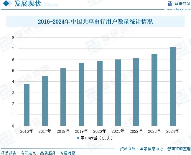 共享出行行业,作为城市交通体系的重要组成部分,近年来在全球范围内迅速发展。通过共享平台将交通工具(如单车、电单车、汽车等)提供给用户使用,这种模式不仅提高了出行效率,减少了环境影响,还降低了个人出行成本。随着城市化进程的加快、居民出行需求的不断增加以及环保意识的提升,共享出行已成为城市交通的重要组成部分,并展现出强劲的增长潜力。近年来,我国共享出行用户数量不断增加。数据显示,中国共享出行用户数量从2016年的3.8亿人增长至2024年的7.1亿人,年复合增长率为8.13%。随着我国共享经济的发展以及公共交通基础设施的完善,预计将有更多人选择绿色共享出行方式。