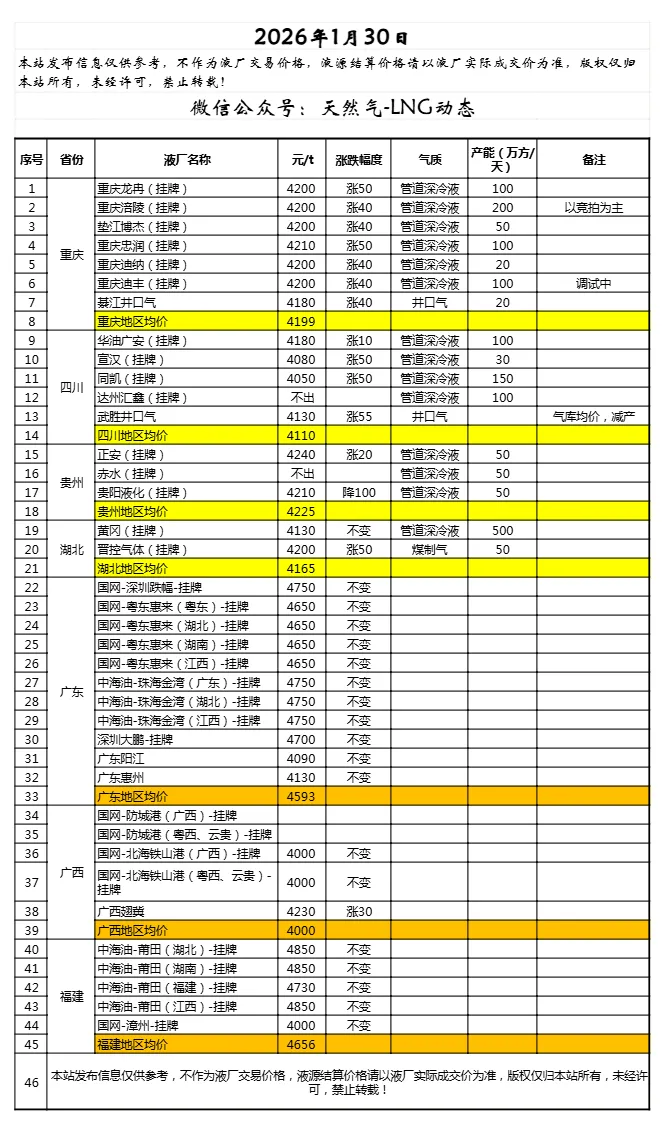 2026年1月30日LNG价格——涨跌互现,节前最后的疯狂