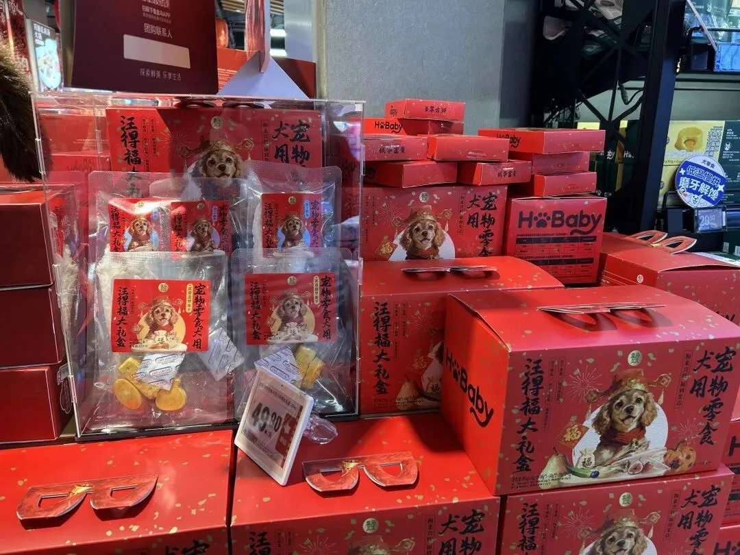 线下,各类宠物主题消费也吸引着“毛孩子”家庭前来体验。在广州一家商超,一个布置得红红火火的宠物年货展柜前围着不少顾客,很多人正在为自家宠物挑选新年礼物。