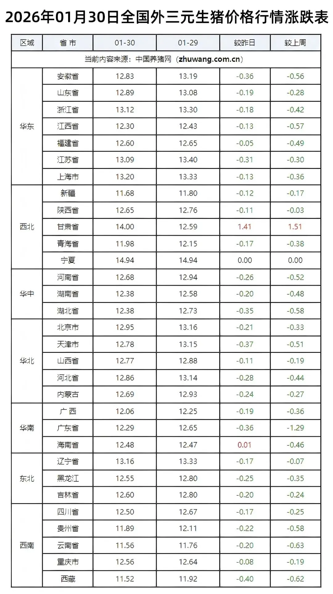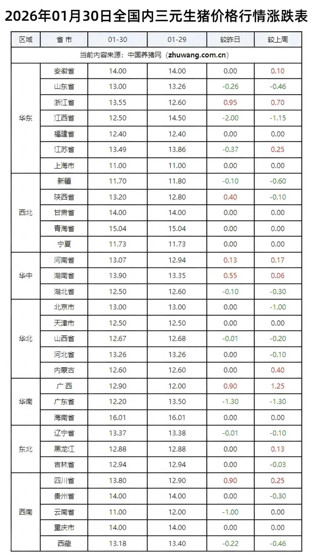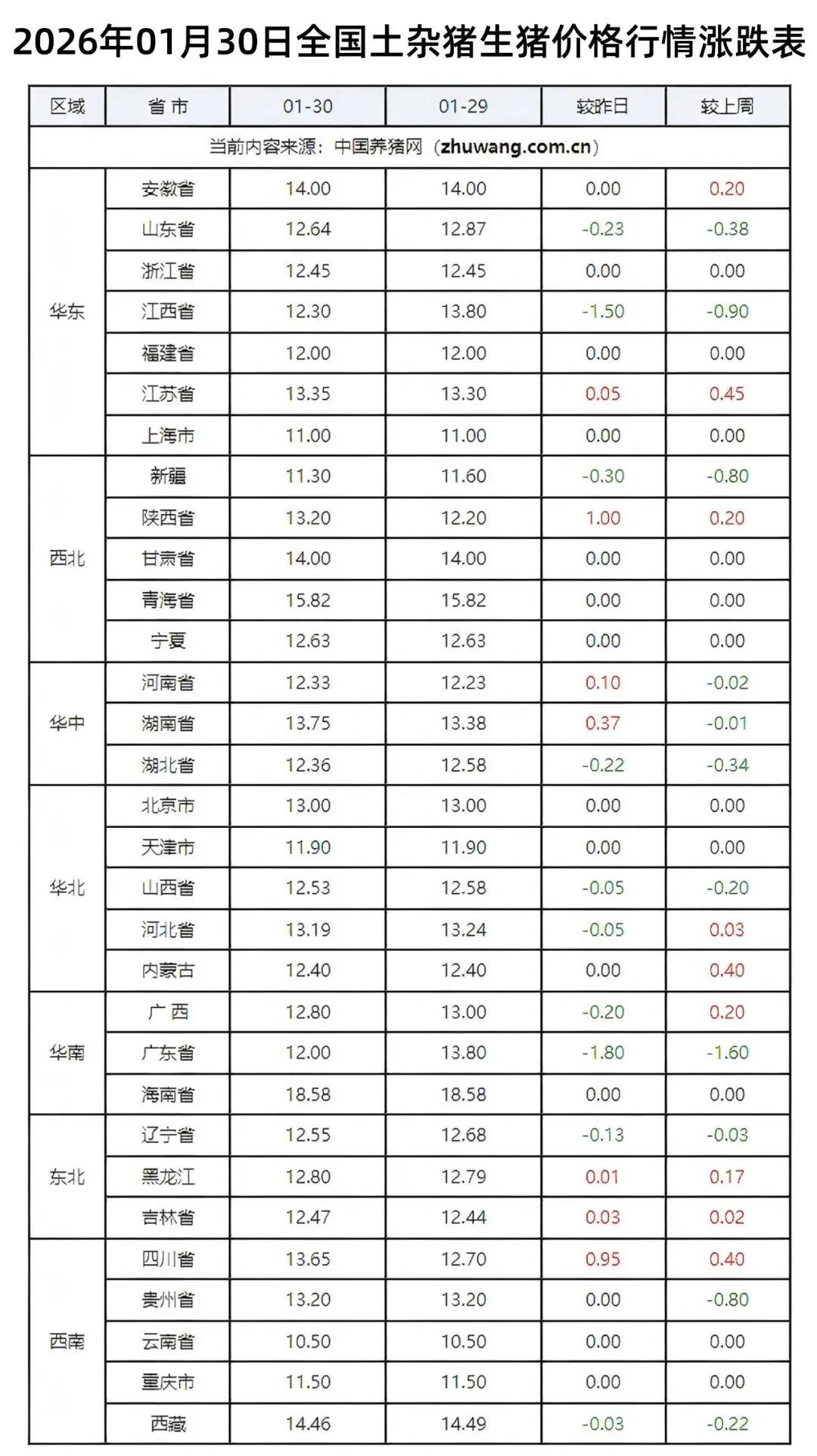 >2026年1月30日全国生猪价格行情涨跌表