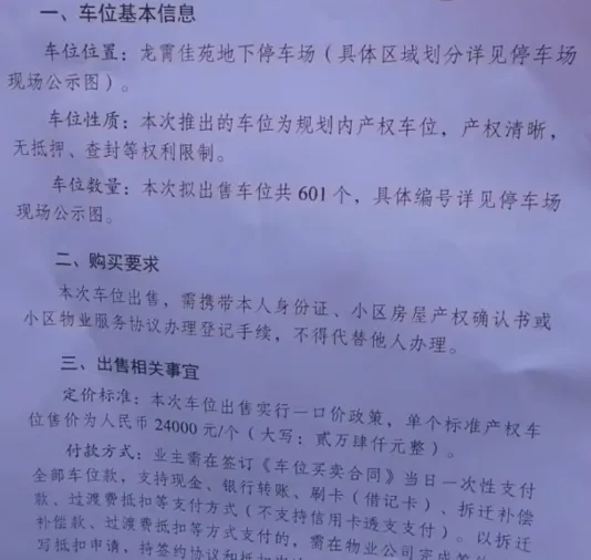 萧县一安置房小区出售601个车位!价格和条款是···