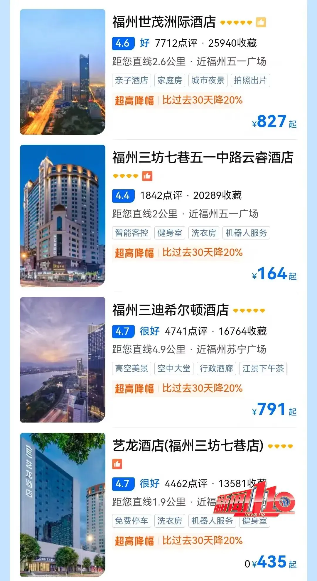 不仅机票价格“跳水”,春节旅游高峰过后,酒店、旅行社等价格降幅均比较明显。某旅游平台数据显示,元宵节后出发,国内热门城市部分酒店价格相较春节期间有30%~50%回落。福州部分热门酒店价格,比过去30天下降了20%左右。