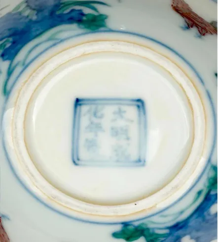 明代成化年间官窑瓷器款识有书“大明成化年制”六字款和“天”字款两种,不见“成化年制”款,且只有楷书款,不见篆书款。成化款肥明代成化年间官窑瓷器款识有书“大明成化年制”六字款和“天”字款两种,成化官窑瓷器年款主要体式为青花楷书“大明成化年制”六字双行款围以青花双重圆圈或双重方框,也有极个别无边栏的。落款位置多在器物外底。特点是字体深沉,无漂浮感,笔法苍劲有力,笔道粗,字体肥,故有“成化款肥”的说法。