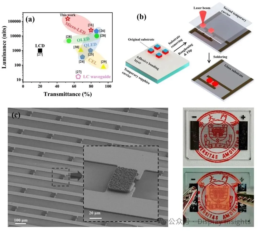 图1 高亮度红光Micro-LED透明屏。(a)亮度对比,(b)巨量转移过程示意图,(c)红光Micro-LED芯片阵列的扫描电镜照片以及透明屏效果