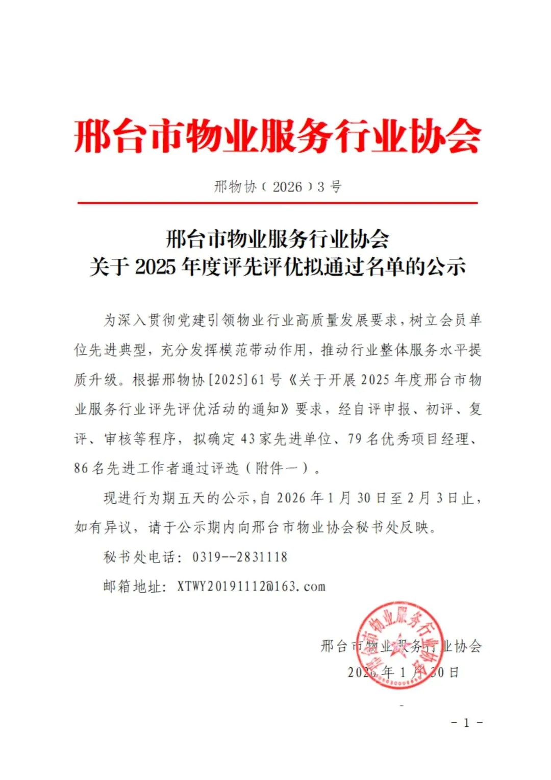 >邢台市物业服务行业协会关于2025年度评先评优拟通过名单的公示