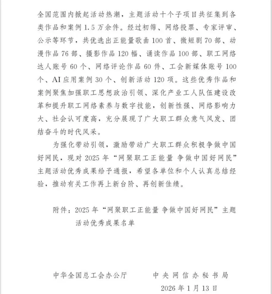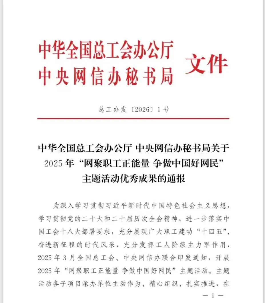 新年伊始,中华全国总工会办公厅 中央网信办秘书局联合通报了2025年“网聚职工正能量 争做中国好网民”主题活动优秀成果。这场全国规格最高、规模最大、影响最广的“工”字号网络正能量年度活动共征集各类作品和案例1.5万余件,网民参与终选投票6600万。在此次全国性评选中,太原市物流货运行业工会联合会荣获两项国家级优秀成果!