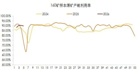 2025年12月,主产区煤炭供应呈现收紧趋势,主要受年末及元旦假期影响,部分煤矿因库存偏高或销售不畅而减产停产。进入2026年1月,供应整体恢复稳定,元旦期间的短暂停产节后迅速复产,影响有限。临近1月底,因部分煤矿完成月度生产任务,供应再度小幅收紧。步入2月,虽然仍有煤矿复产,但随着春节临近,部分民营煤矿提前放假,预计产区供应较1月将明显收紧。