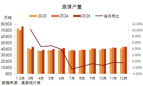 国家统计局数据显示,2025年12月全国原煤产量为4.37亿吨,同比下降1.0%,连续第六个月下降,且降幅较11月扩大0.5个百分点。产量降幅扩大反映出,因销售不畅、库存累积以及临近年底与元旦假期等因素,煤矿普遍通过自主停产减产来调节供应。2025年1—12月,全国原煤累计产量48.32亿吨,同比增长1.2%,增速较1—11月收窄0.2个百分点,全年产量略高于上年的47.8亿吨水平。