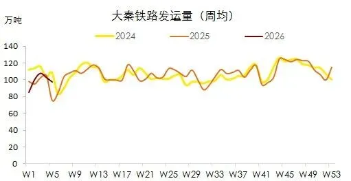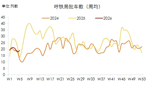 截至1月28日,大秦线周均发运97.7万吨,环比减少5.02万吨;呼铁局周均批车19列,环比增加1列。
