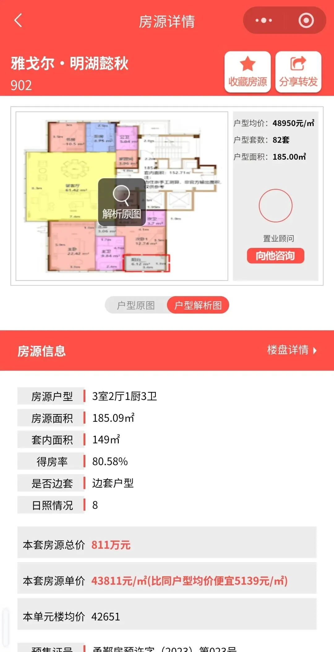 第三套成交的是902单元185户型,750万成交。这种185户型是三房大边厅,户型比首套成交的177要好不少。明湖懿秋、明湖怡府、逸庐、明湖金茂府,这四个紧挨着的高端小区在产品设计上都是提前做好互相差异化的。在选房上,要能充分认识到这些产品设计差异,再根据价格做好分析、比较面积段房子选择买卖。而且现在明湖懿秋、明湖怡府交付后,颜值、品质、物业管理服务等已经具体呈现,逸庐大约能看出具体品质的八成,明湖金茂府大约能看出七成。这四个高端小区一定会在互相竞争中分出个胜负,还有学区更好的明湖悦府就在旁边。