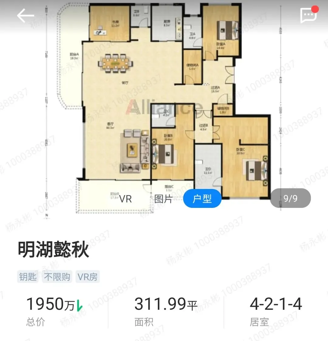 明湖懿秋业主终于可以缓起精神,第三套好房成交,行情价格明显好转。在上套255户型1108万包税成交之后,和它同楼幢的临湖310户型业主的出售价格预期,大幅下调到破发价1780万。懿秋在开盘时并没有拉开一线湖景户型与其它户型的预售价,这个破发价格并不是简单的字面差价。大家觉得一线湖景的310户型,现在大约多少会成交呢?