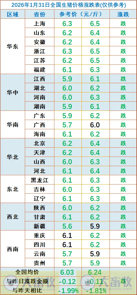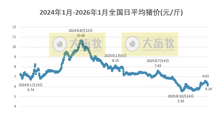 大畜牧根据27省的猪价数据,计算出2026年1月31日全国平均猪价为每斤6.14元,比昨天下跌0.12元,跌幅为1.9%,跌幅扩大,且连续6天下跌,累计下跌0.37元,为1月最低价。