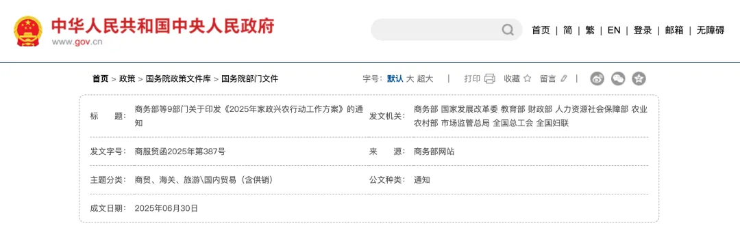商务部等9部门关于印发《2025年家政兴农行动工作方案》的通知商服贸函2025年第387号