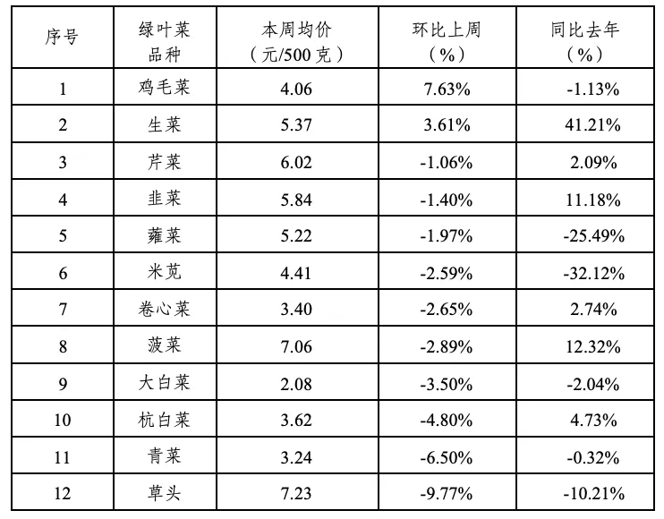 重点品类:12种绿叶菜零售均价为4.80元/500克,环比下跌2.48%,同比下跌2.52%。具体品种价格变动如下: