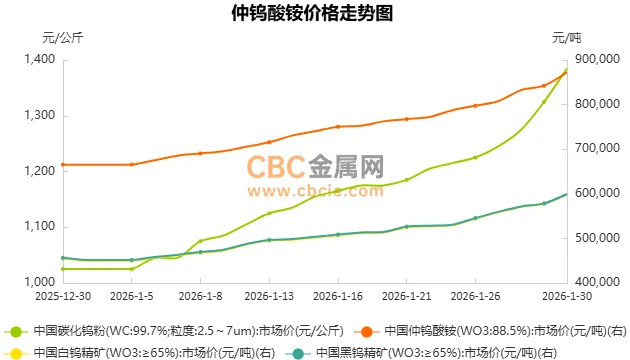 今日中国仲钨酸铵(WO3:88.5%;APT)市场含税现款报价上涨,目前在871900~872900元/吨,均价872400元/吨,较昨日上涨30000元/吨。