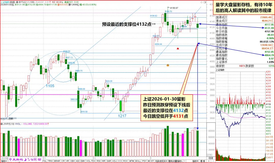 今日实际向下跳空26点在4131点开盘,精准对应下下线4132点开盘,是明确的降维信号,符合昨日看跌预判。
