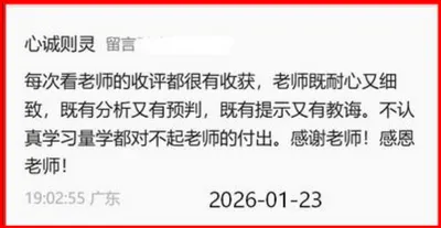 广东“心诚则灵”留言:每次看老师的收评都很有收获,老师既耐心又细致,既有分析又有预判,既有提示又有教诲,不认真学习量学都对不起老师的付出。感谢老师!感恩老师!