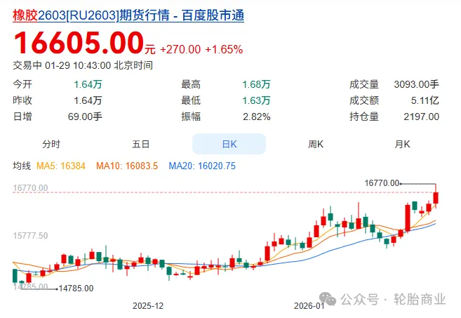 2026年1月29日,橡胶主力价格来到了16605元/吨,这个数字看似不算历史高位,却藏着惊人的涨幅。要知道,2025年11月橡胶价格一直稳定在14500元/吨左右,前几天还维持在15000元/吨上下,短短几天就每吨暴涨一千元以上。
