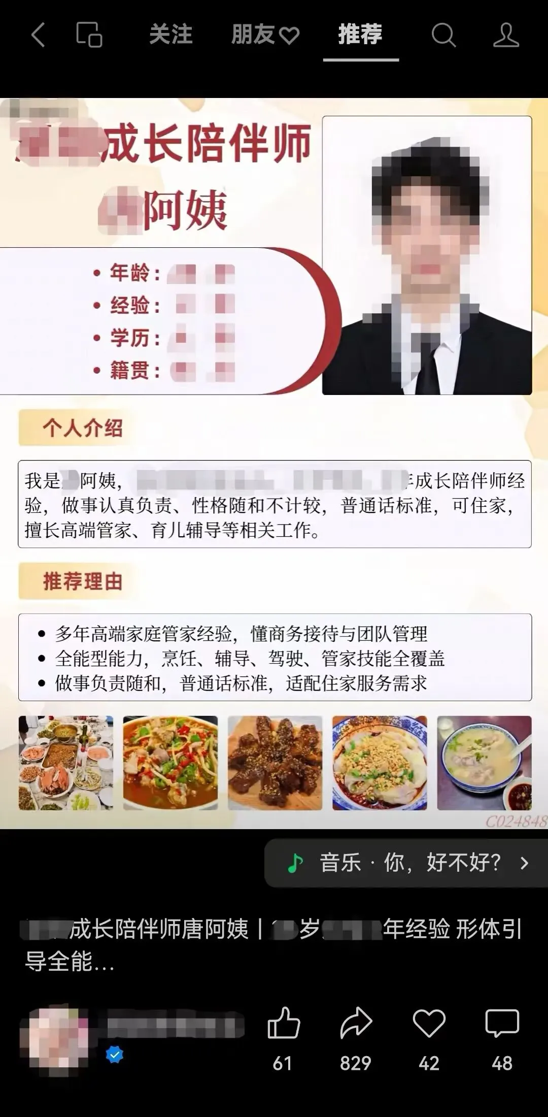 最近刷到一条颇具争议的视频。一则“成长陪伴师”的招聘信息中,应聘者是一位来自四川的年轻男性,但在简历与介绍中,他被统一称为“阿姨”。