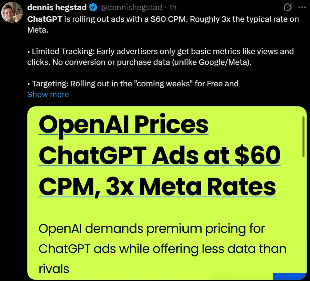 据The Information爆料, OpenAI已经开始筹备广告服务 。作为广告界的新手,OpenAI的定价竟然比Google和Facebook(Meta)这些老油条都要贵得多—— 整整贵了3倍 。OpenAI啥数据都不给,只告诉你"大概有多少人看过"根据曝光的数据, OpenAI的广告报价约为CPM 60美元 。CPM = Cost Per Mille = 每千次展示成本- 广告商想让自己的广告在ChatGPT上展示1000次