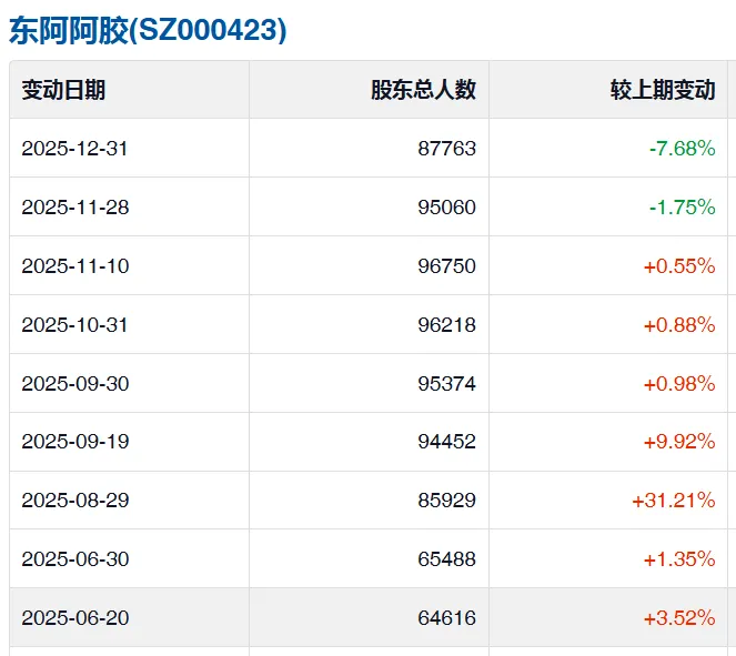 数据显示,截至2025年12月31日,东阿阿胶A股股东总户数为8.78万户,较上期(2025年11月28日)减少7297户,降幅7.68%。