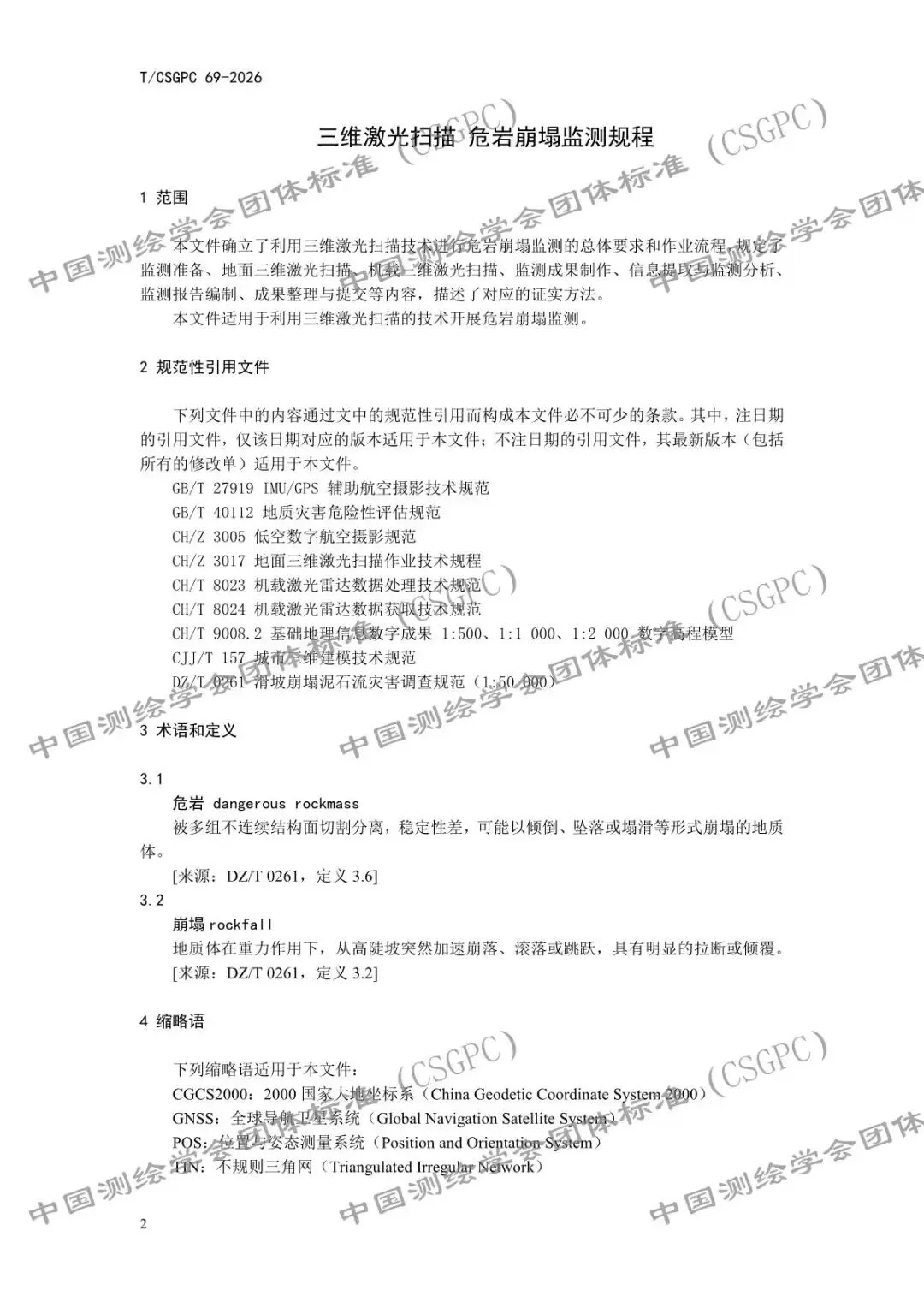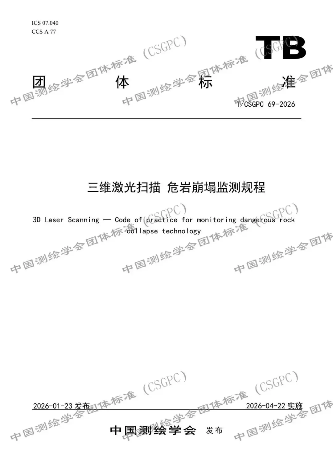 《三维激光扫描 危岩崩塌监测规程》(T/CSGPC 69-2026)CSGPC标准已按规定程序完成制定,现于2026年01月23日首次批准发布,自2026年04月22日起施行。