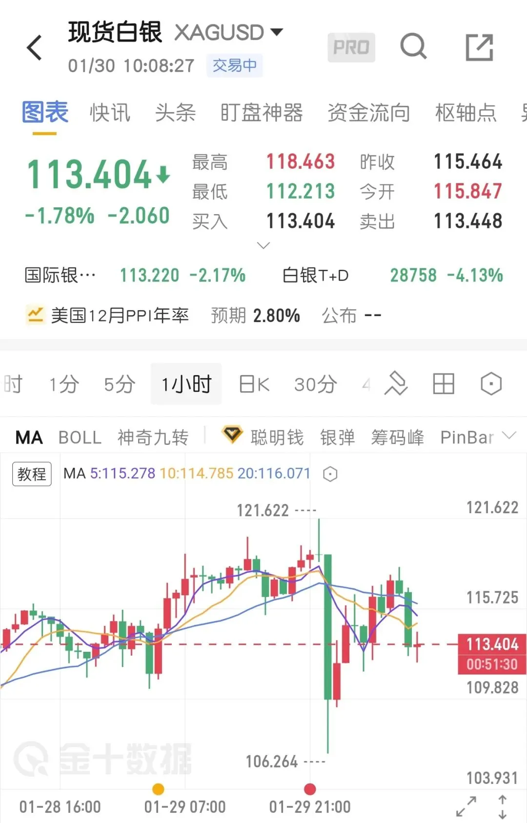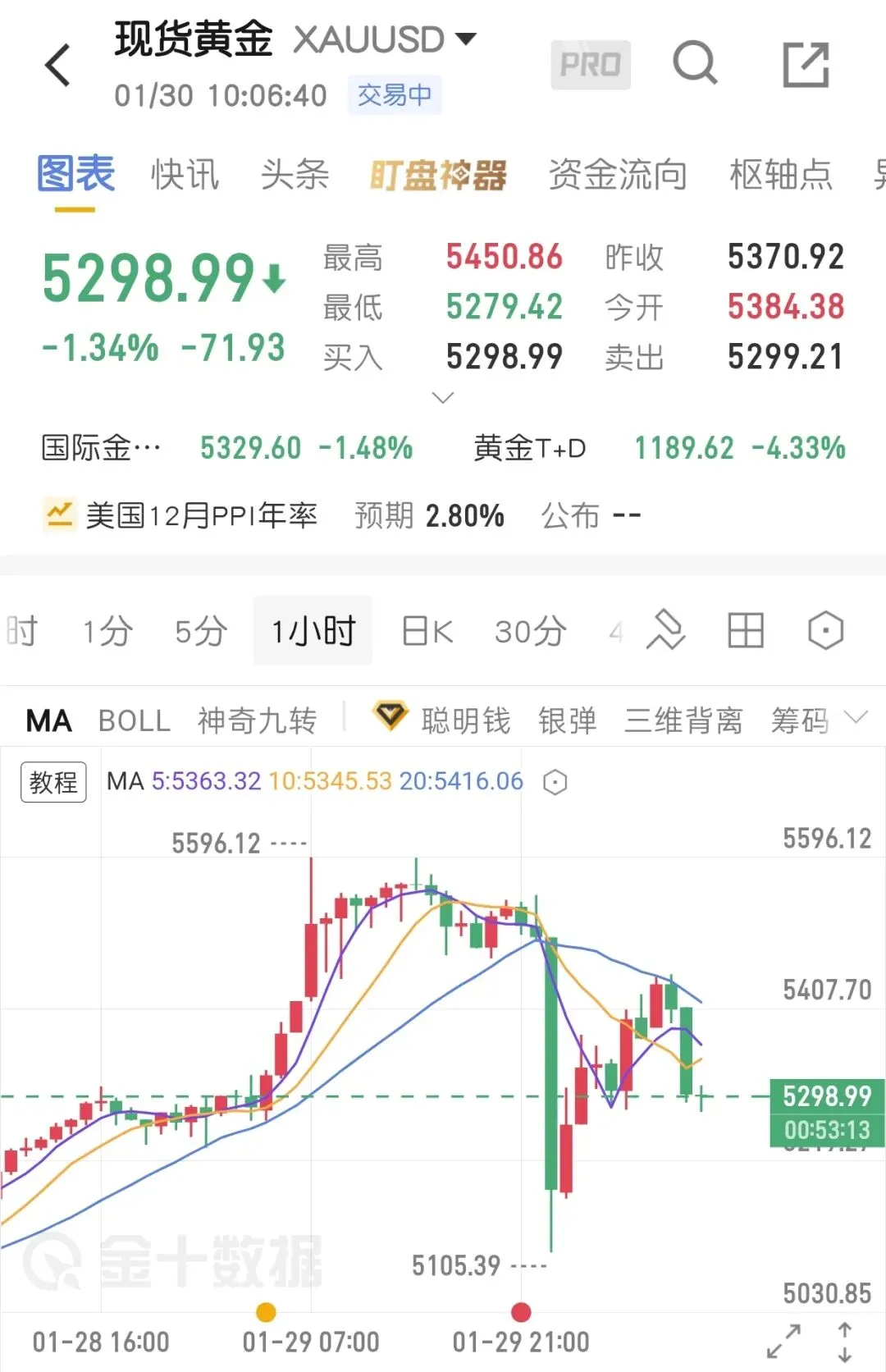 昨日(1月29日)现货黄金价格出现史诗级波动,盘中振幅近500美元。金价在周四亚市早盘触及5598.18美元的历史新高,随后在纽约时段暴跌至5102.48美元,现(1月30日)报5293美元/盎司附近。现货白银跌至113美元附近。