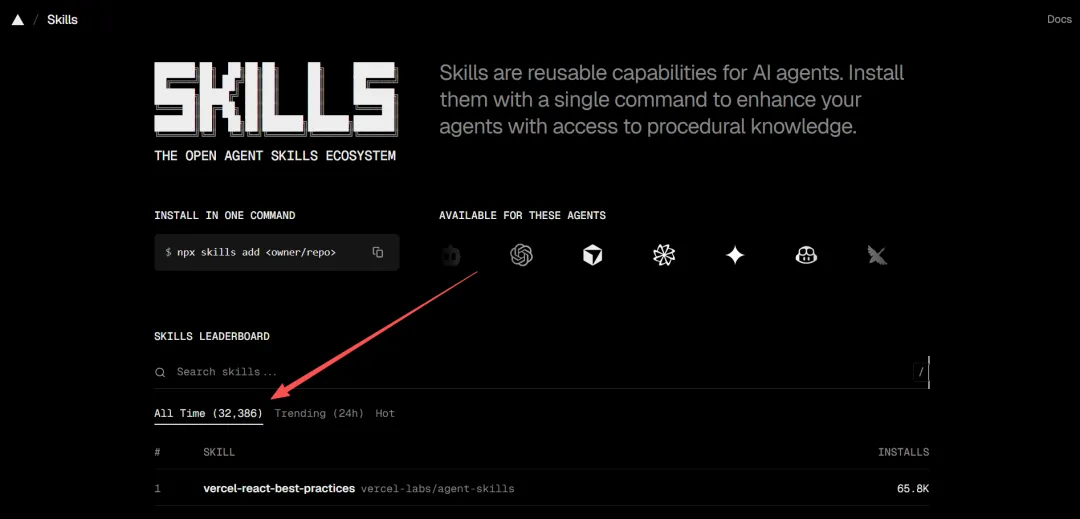 聊实操前,先爆个变态网站——skills.sh。第一次刷到的时候,直接懵了:还有这种东西?超多Agent skills,全免费。从全栈网站开发、精细UI设计,到数据库管理、自动生成PPT、专业SEO优化——这些以前要么砸大价钱请人,要么熬几个通宵啃教程才能搞定的活儿,现在全躺在那儿任你挑。