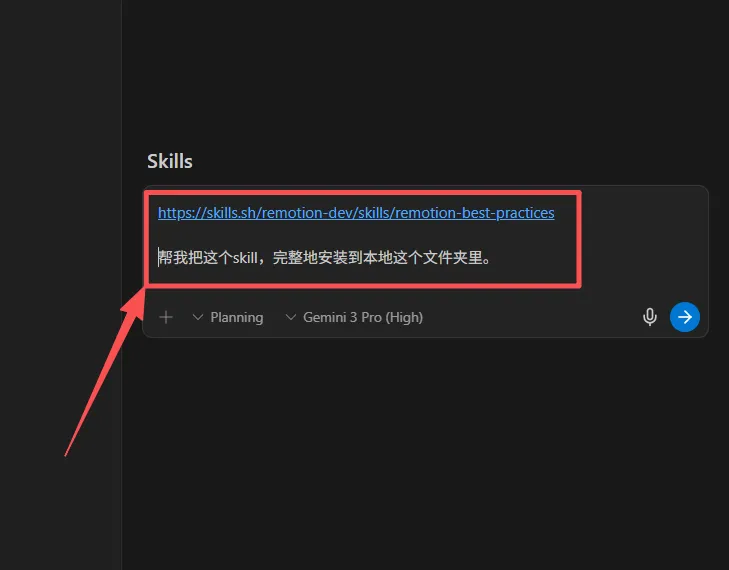 打开常用的Antigravity,导入这个空文件夹,把Skill地址扔对话框里,直接下死命令:帮我把这个Skill完整安装到本地文件夹里。