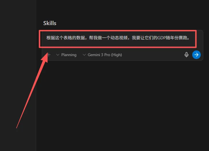把表格拖进文件夹,对着AI说:根据这个表格的数据,做个动态视频,让各国GDP随年份赛跑。
