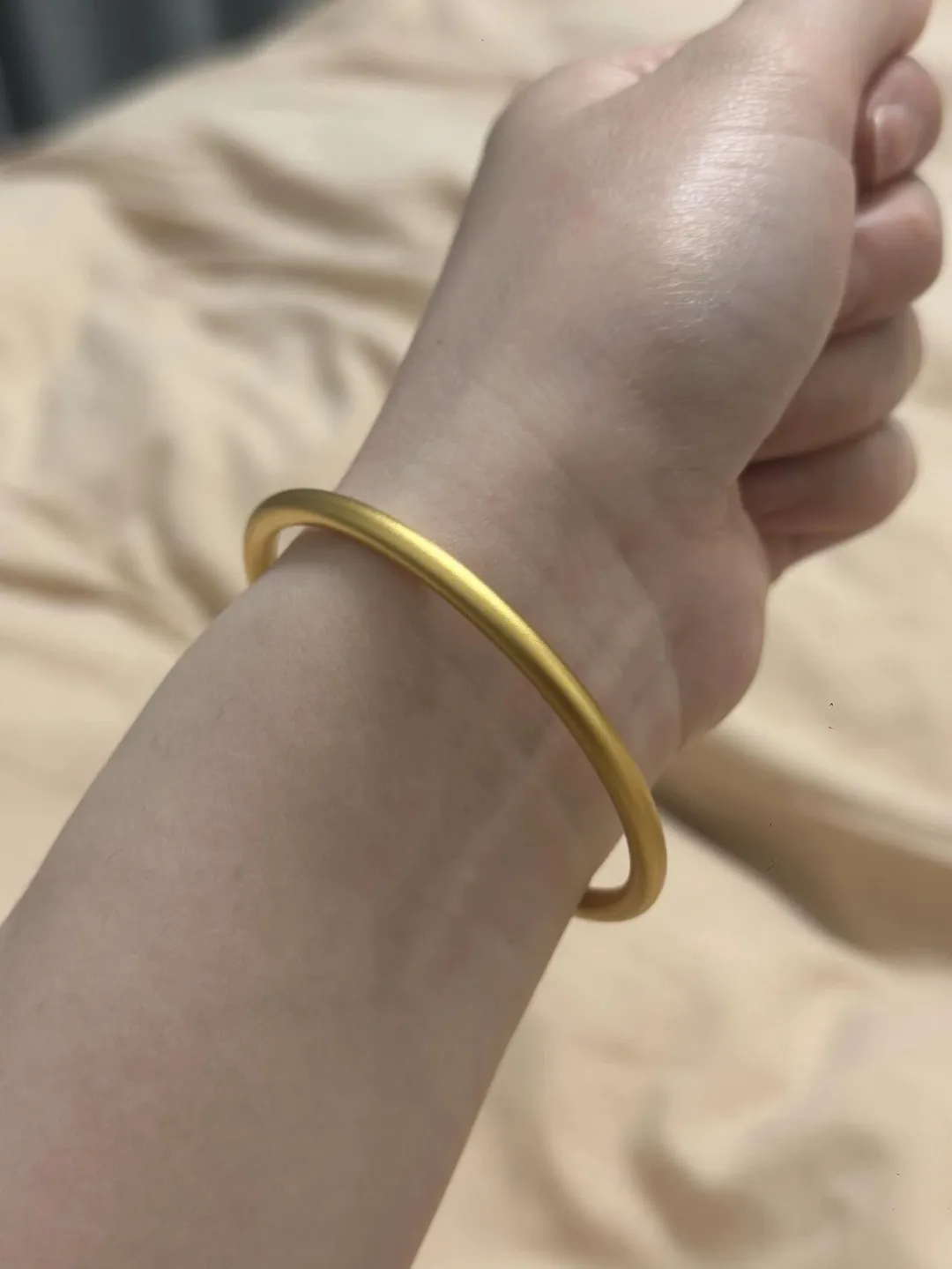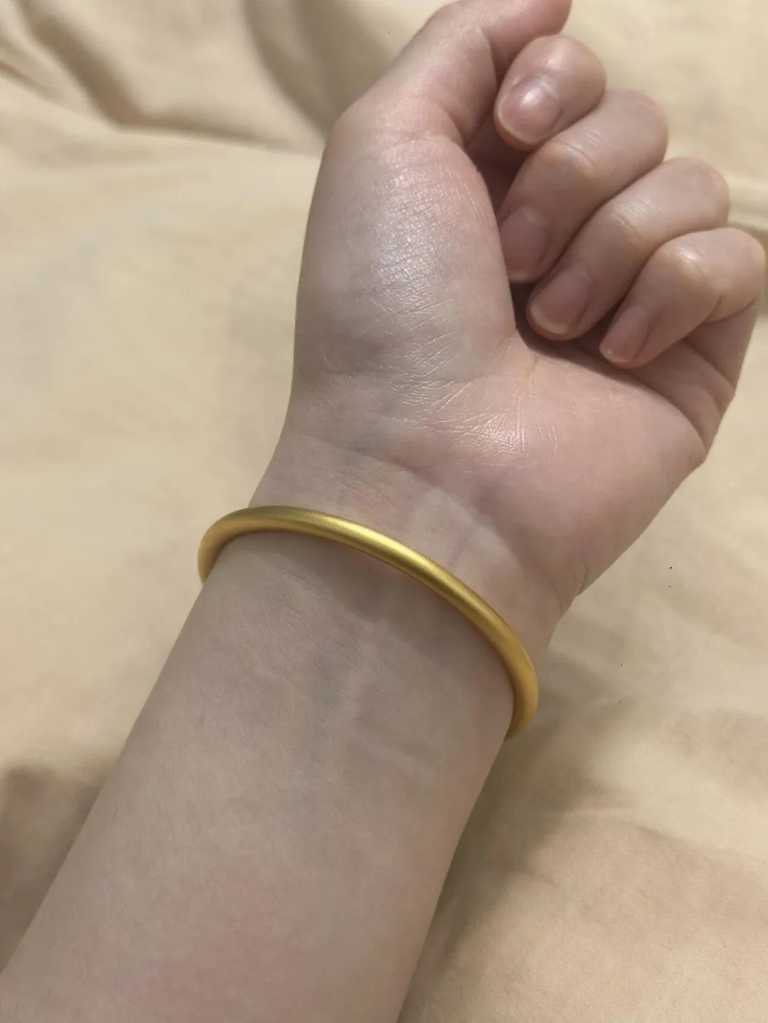 颜色嘛,足金的那种暖金色,真的很显手白,也不会过分张扬,工艺是细磨砂面,摸上去手感细腻,不容易留下划痕,真的很贴心!