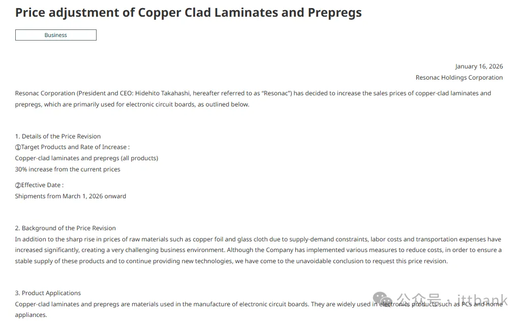 1月16日,日本半导体材料大厂Resonac(原昭和电工)宣布,由于铜箔、玻璃纤维布(glass cloth)等原料供需紧绷、价格飙涨,叠加人事成本、运输费用显著上升,因此将自2026年3月1日起调涨覆铜层压板及黏合胶片价格30%。