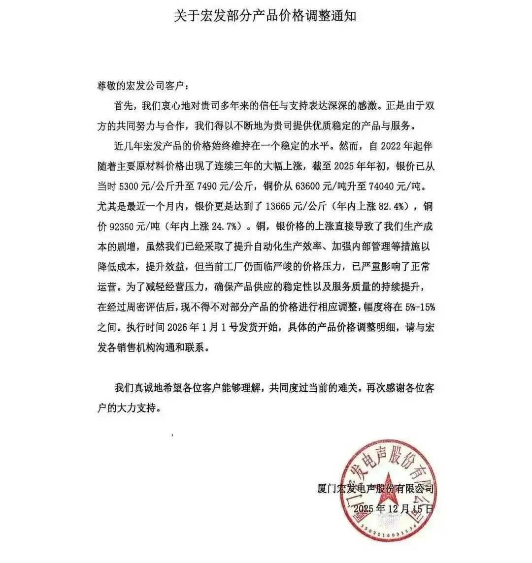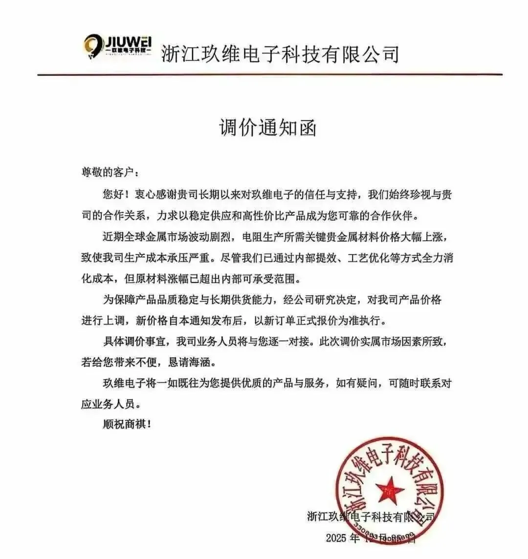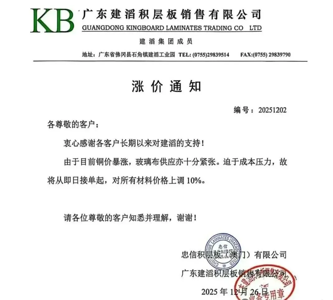 2025年11月,南亚塑胶工业股份有限公司电子材料事业部发布涨价函,表示因国际LME铜价、铜箔加工费、电子级玻璃布等上游原料集体上涨,为保障长期稳定供应,决定从11月20日起(以交货日为准),对全系列CCL产品及PP(半固化片)统一上调8%。
