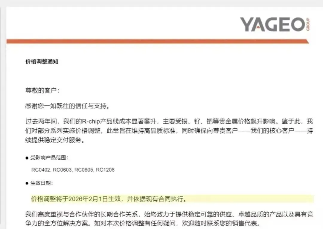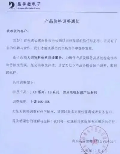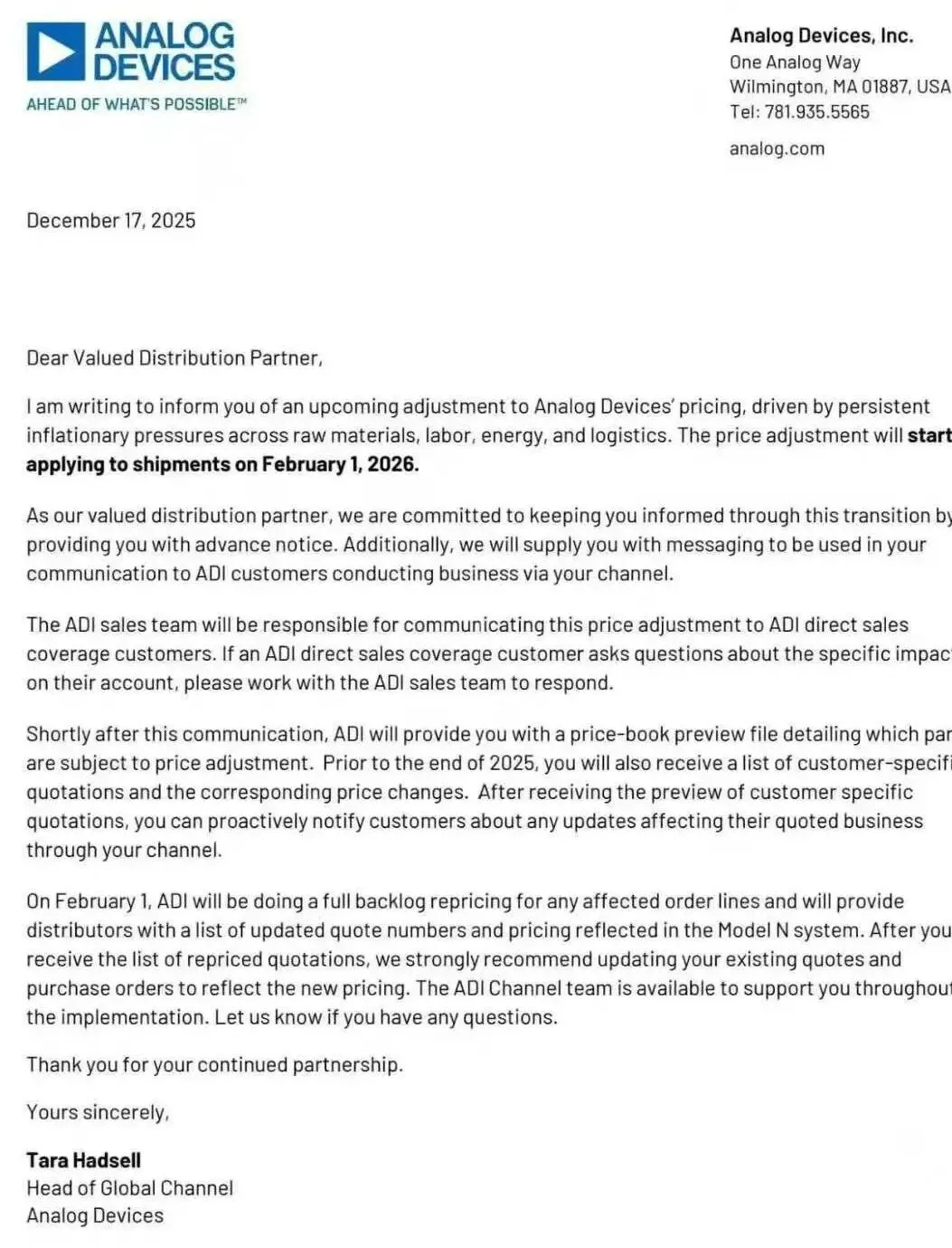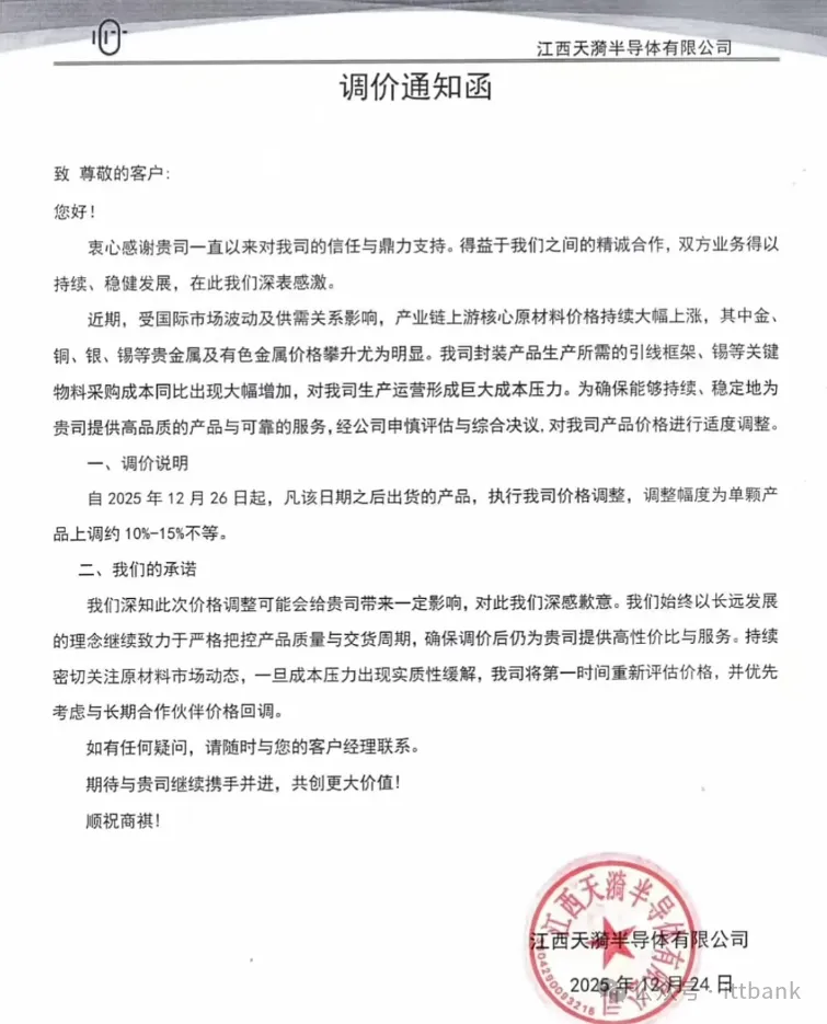 去年12月中旬,市场上流传的一封ADI最新涨价函显示,ADI此次调价主要是由于原材料、人工、能源及物流等方面持续存在的通胀压力所致。新的价格将适用于 2026 年 2 月 1 日起发运的订单。