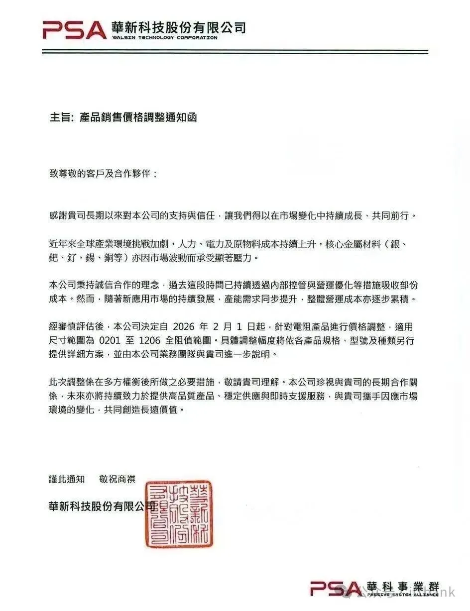 华新科:调涨0201-1206电阻产品