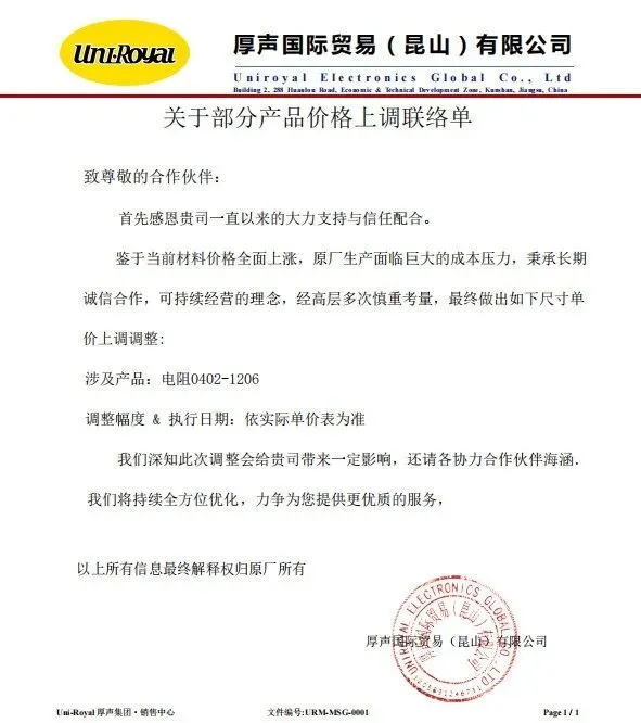 厚声:调涨0402-1206电阻产品