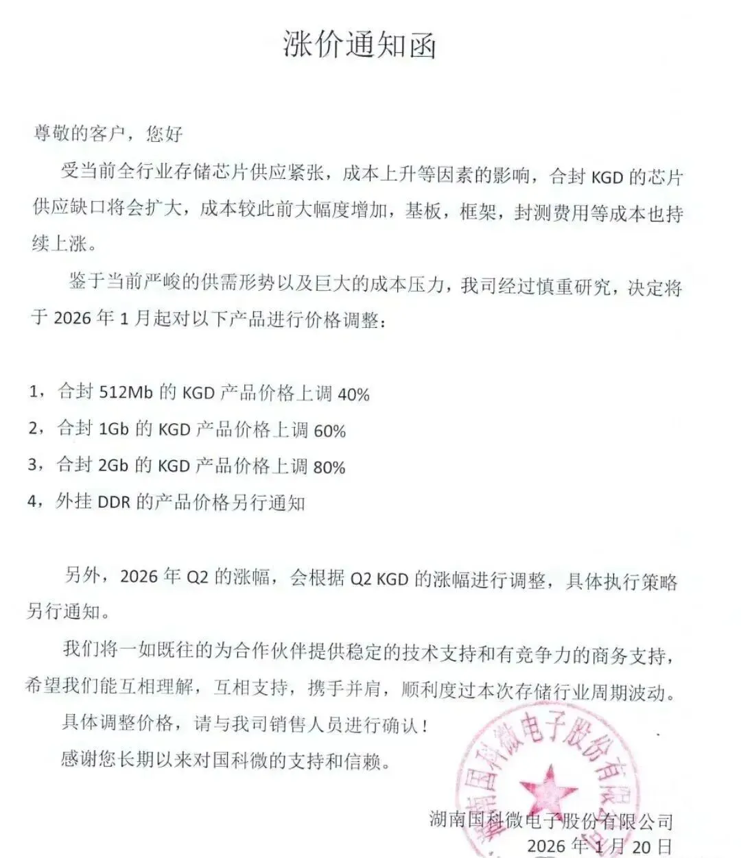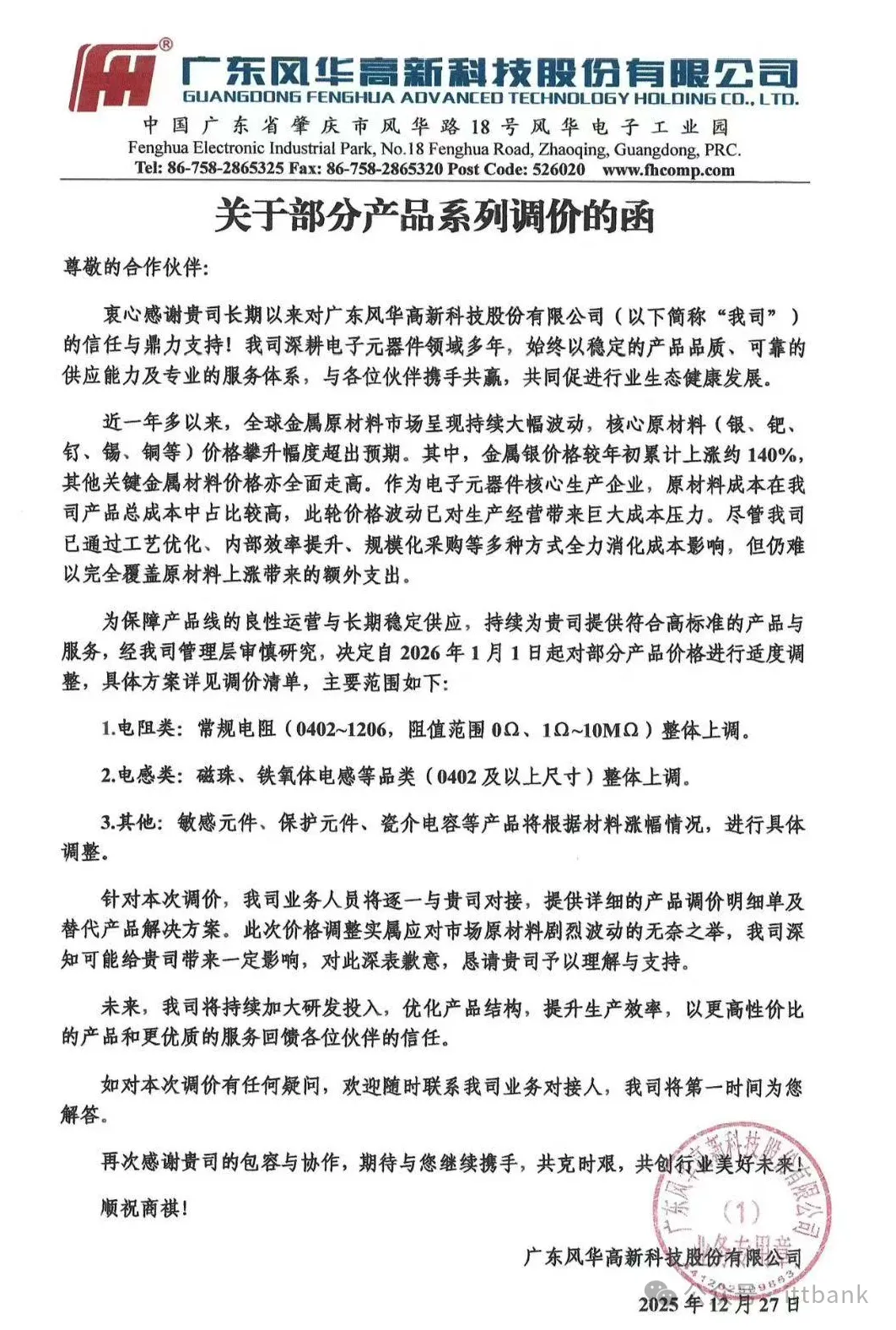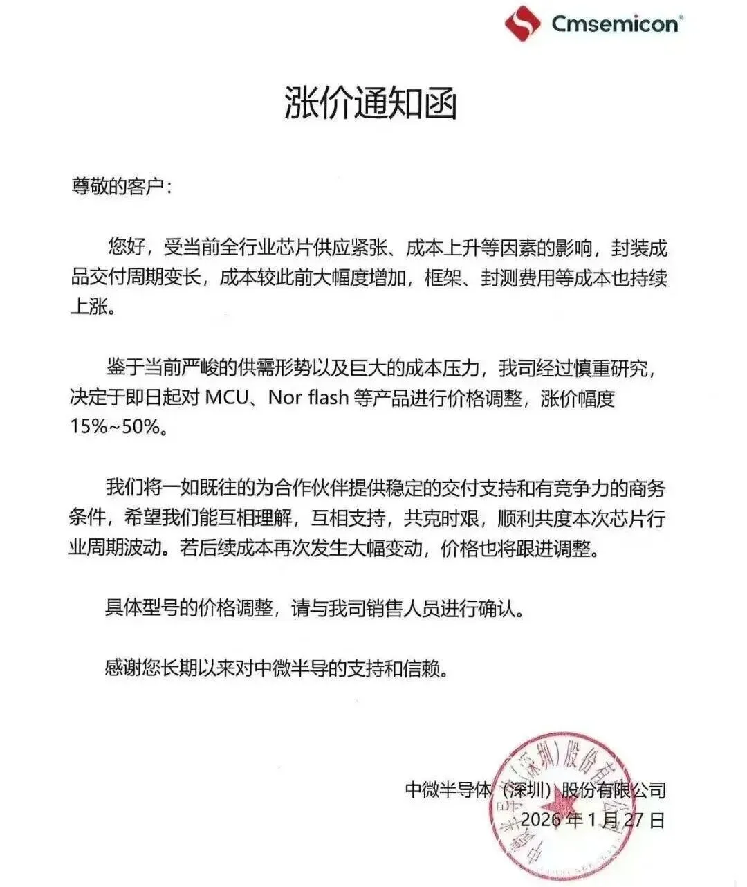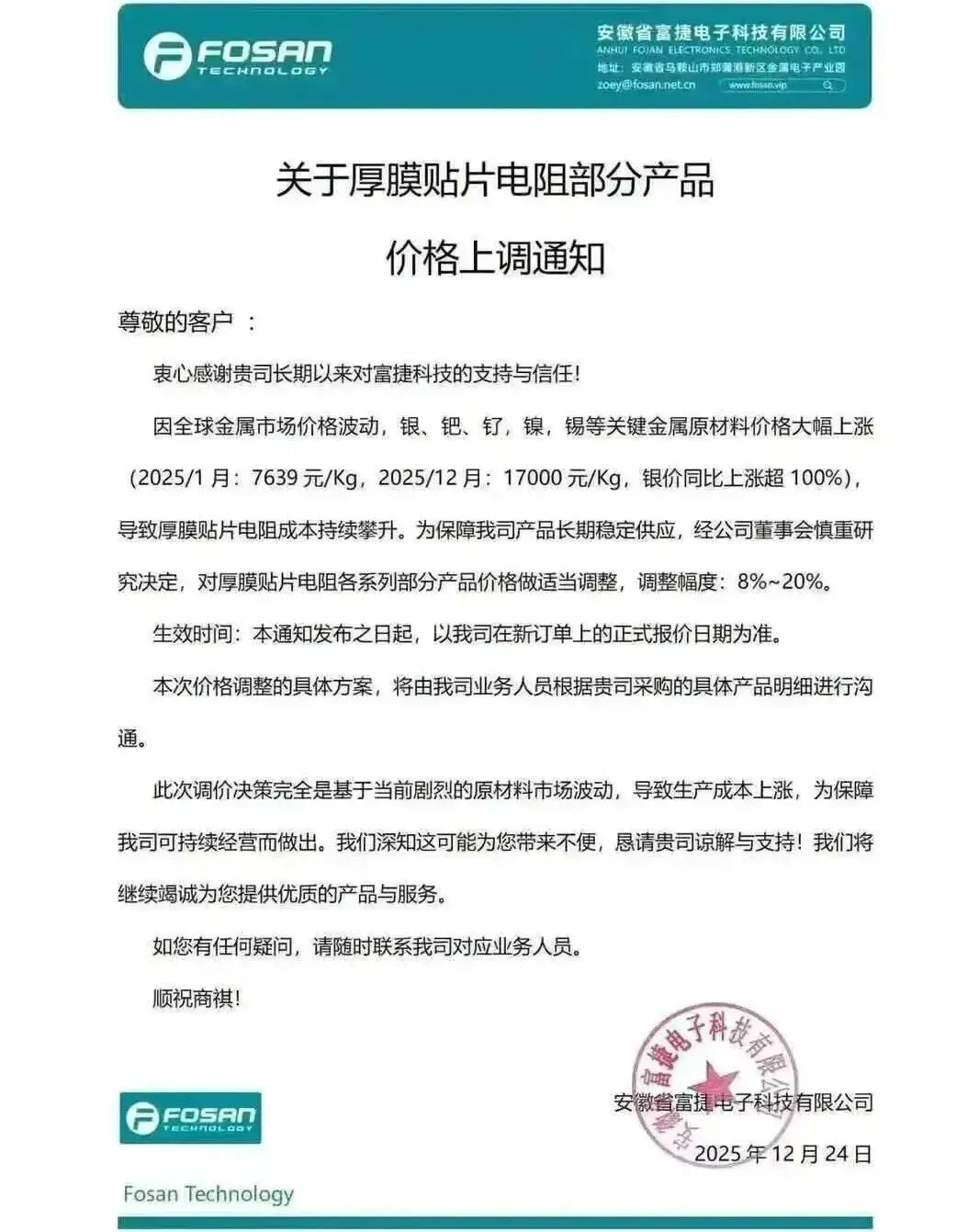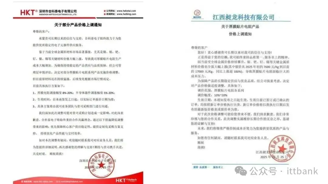 深圳合科泰电子发布涨价函,对厚膜电阻调涨幅度8%-20%,半导体器件调涨幅度5%-20%,新价格以实际订单报价日期为准。