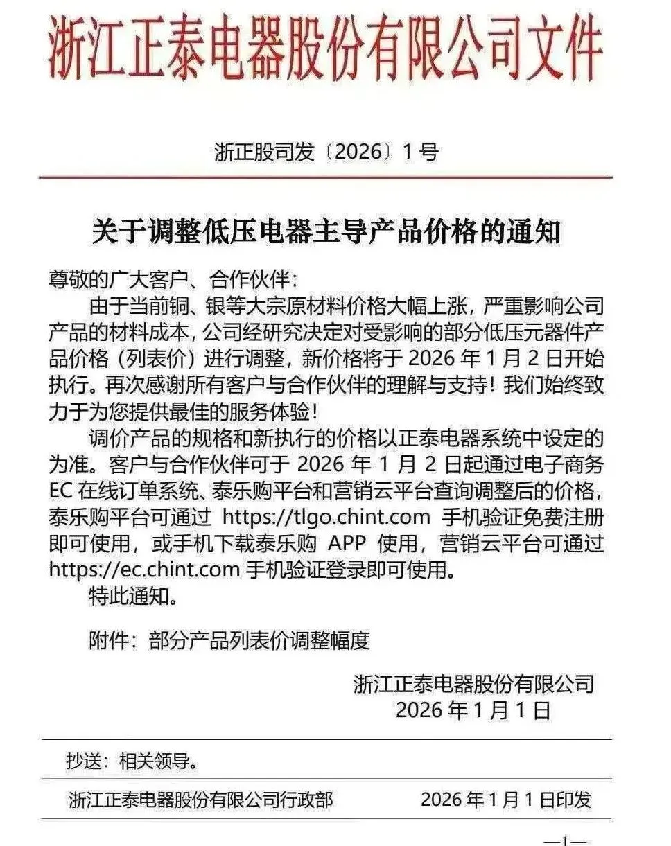 2025年12月4日,TE Connectivity向全球渠道合作伙伴发布调价通知。通知表示:TE将在所有区域实施价格调整,自 2026 年 1 月 5 日起生效,适用于所有 TE 授权分销商。