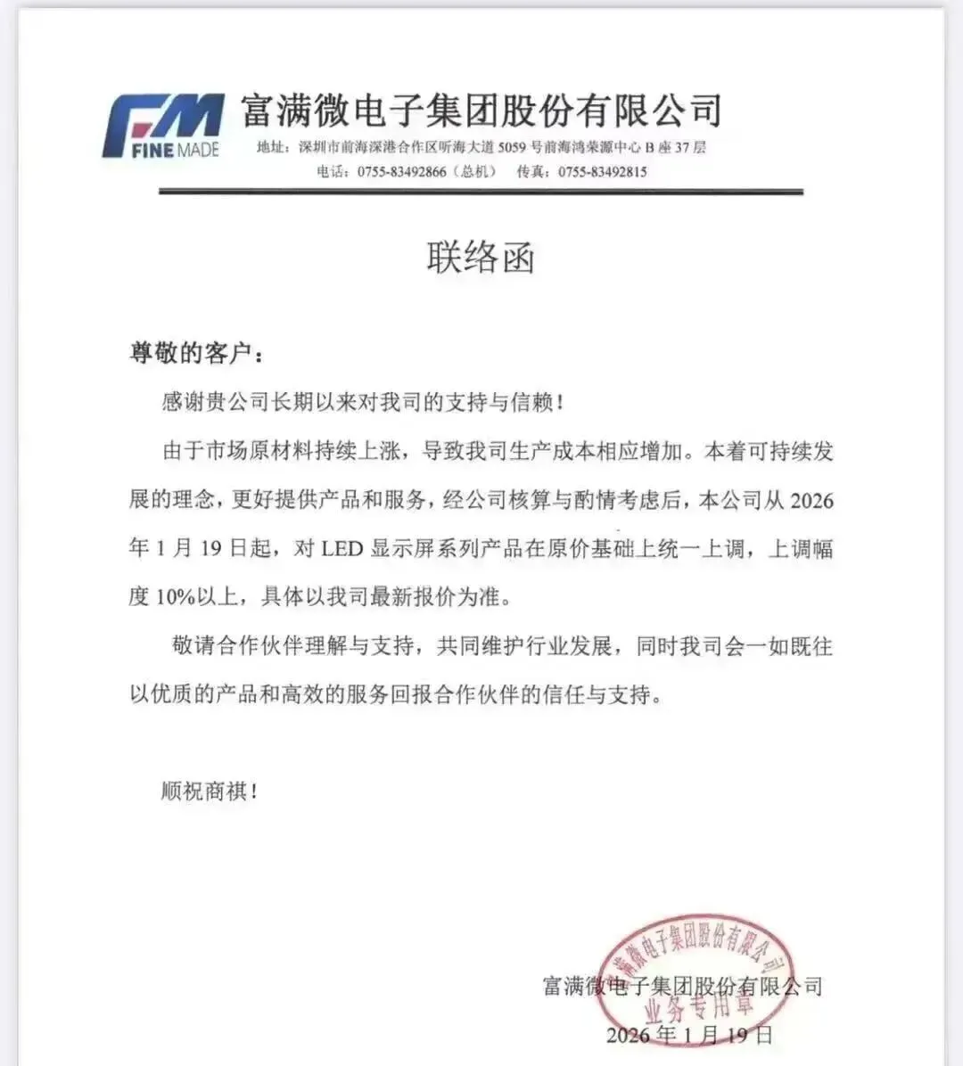 富满微:LED显示屏系列产品涨价,不低于10%