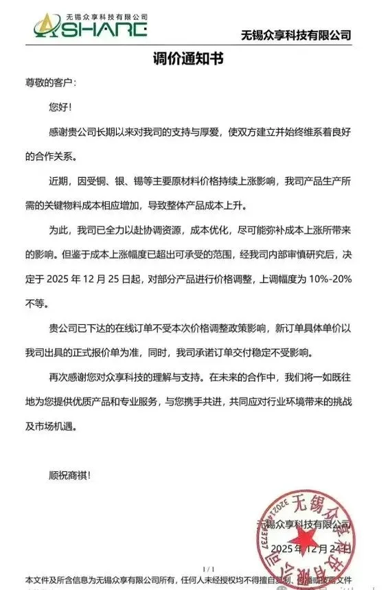 无锡众享科技:部分产品调涨10%-20%