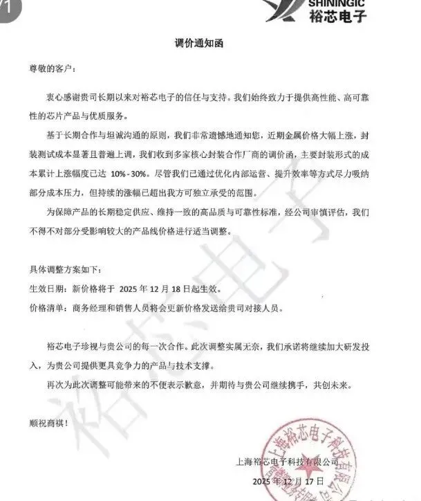 裕芯电子:上调受成本影响较大产品线价格