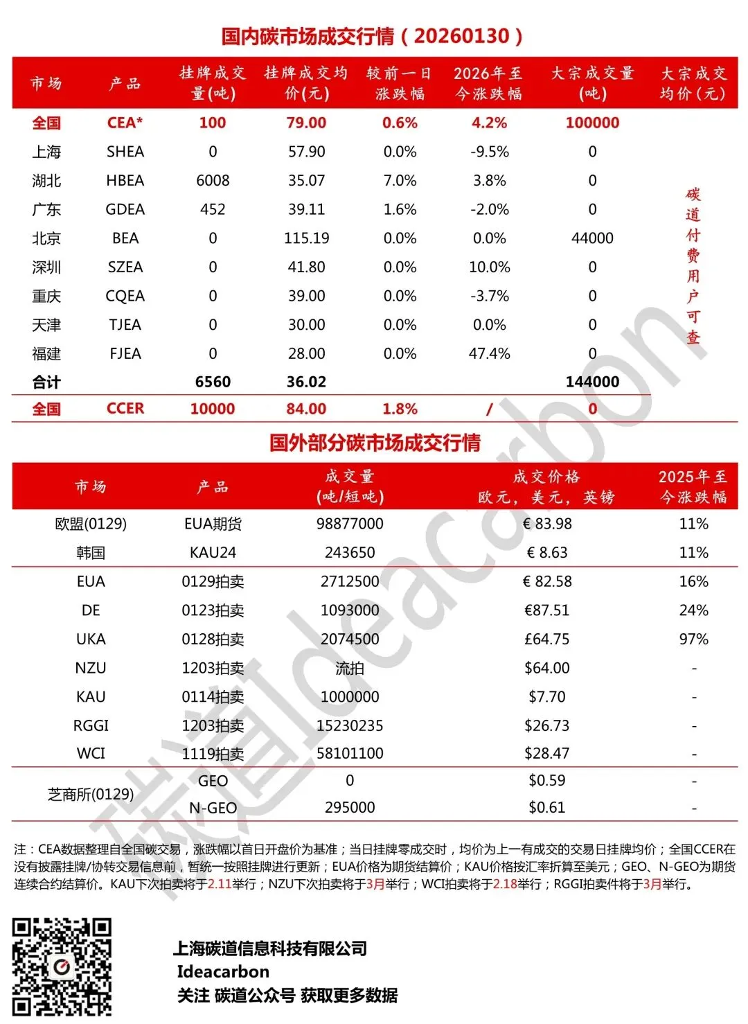 每日碳市场成交行情(20260130)
