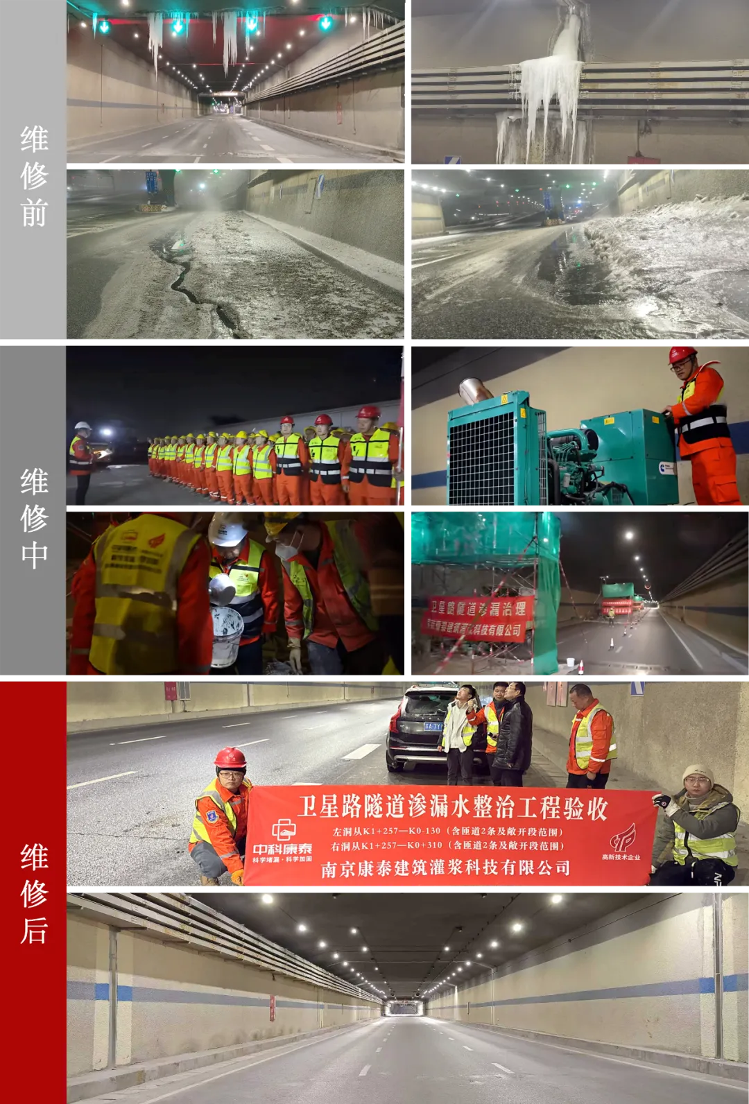 图片说明| 卫星路南延地下隧道是乌鲁木齐新客站重要配套市政设施,竣工投入使用后渗透严重,历经多支队伍维修,反复渗漏,一筹莫展。南京康泰前后历时三年,动用100多专业工人、16辆施工车、5台价值几百万的进口发电机及20台套堵漏装备,克服极端气候、施工空间窄等诸多困难,采用了15项发明专利和2项核心技术,联合多家高校联合课题攻关,得到文忠的大力支持,圆满了完成任务。经过三个冬季考验,合同内约定责任范围内达到滴水不漏的标准!可点击观看下方专题片了解详情